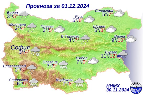 Времето ще остане облачно, особено в югозападната половина на страната. Валежите ще бъдат предимно от дъжд, като във високите полета те могат да бъдат примесени със сняг. Значителни количества валежи ще паднат в Рило-Родопския регион.