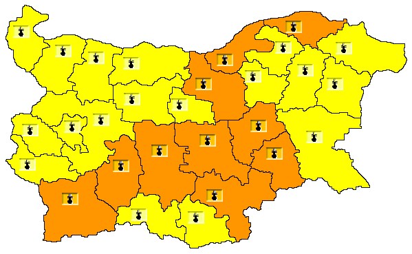 Обявен е оранжев код в 10 области на Южна България. Той важи за Силистра, Русе, Велико Търново, Сливен, Ямбол, Стара Загора, Хасково, Пловдив, Пазарджик и Благоевград.