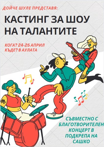 Кастингите за концерта ще се проведат на 24 и 25 април в аулата на Дойче шуле, като желаещите трябва да се запишат чрез този линк.