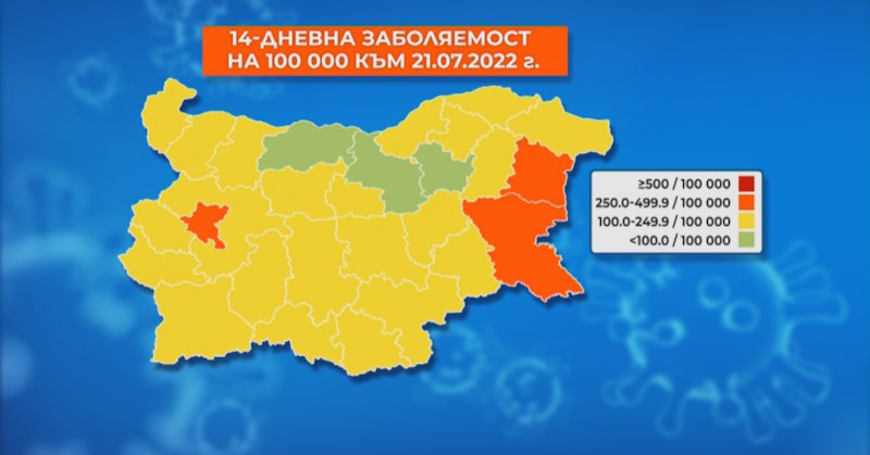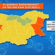22 са областите, навлезли в жълтата зона по разпространение - или т.нар. етап 1 от плана на правителството за справяне с пандемията. В зелено са оцветени единствено Плевен, Велико Търново и Търговище.