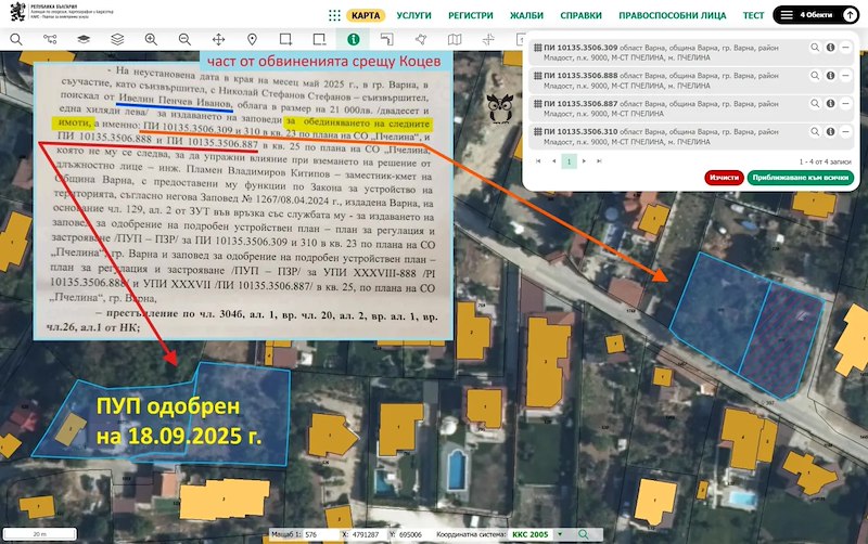 От BIRD.bg обаче твърдят, че проверка в Кадастъра показва друго. За два от парцелите ПУП е одобрен на 18 септември 2025 година, като възложители са три други физически лица, а не свидетелят Иванов или негова строителна фирма. Другите два парцела, според Кадастъра, са собственост на фирмата "Апартинвест Иванови" ООД, притежавана от Ивелин Иванов и брат му.