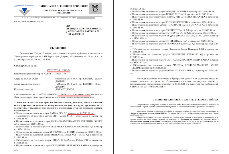 Според BIRD.bg, през 2018 година НАП е наложила запори върху банковите сметки на фирмата на Ивелин Иванов, "Сле Груп-01" ЕООД, на стойност над 800 хиляди лева. От разследващия сайт посочват, че приходната агенция "случайно (или не) пропуска да запорира самите дялове на фирмата".