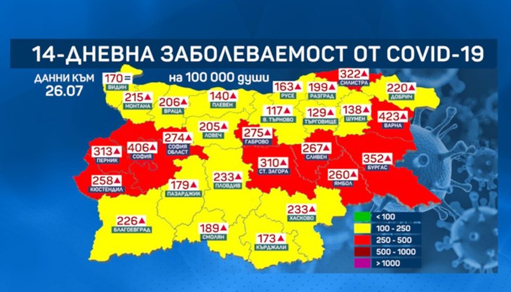 Общата заболеваемост за страната се покачва и днес е 276 на 100 000 души. Вчера бе 251.