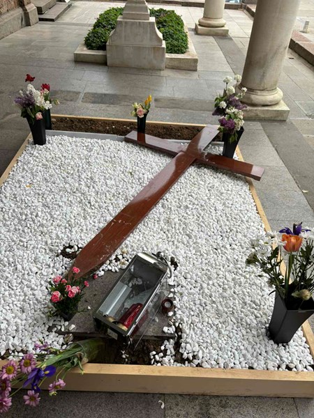 Кръстът е изваден от гроба и част от него е счупена, както и част от мрамора