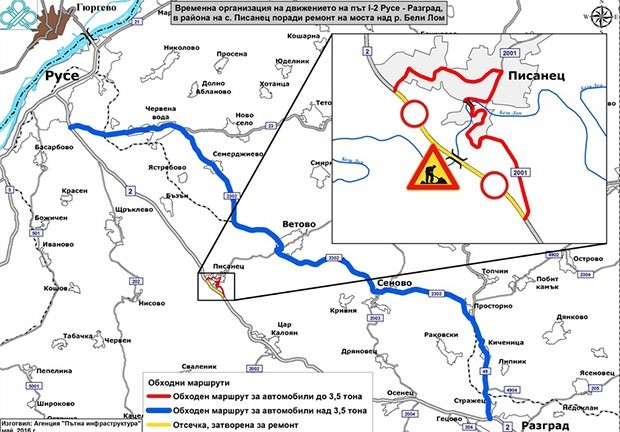 При ремонтно-възстановителните дейности трафикът на леки автомобили до 3,5 тона ще се насочва от Русе - Разград при кръстовището с пътя Писанец - Ветово, преди моста над река Бели Лом, и ще продължава по общинския път през село Писанец и отново ще се включва по пътя Русе – Разград.