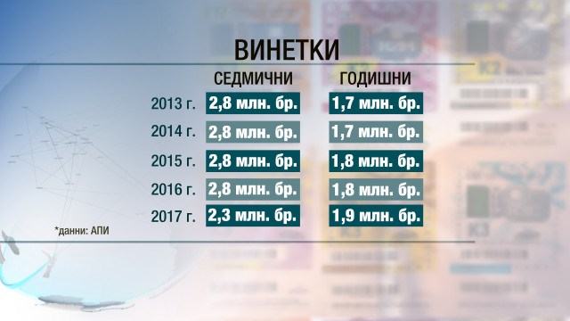 Статистиката на АПИ за пет години назад показва, че и при по-евтините винетки още от 2013 г. насам, продадените седмични стикери държат първото място. Запазват приблизително едно ниво 2,8 млн. лв. годишно.