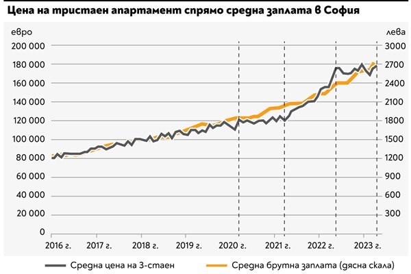 Например графиката за ръста на средната брутна работна заплата за столицата от 2016 до 2023 г. и графиката за средната цена на тристаен апартамент по офертни цени за същия период на практика са еднакви.