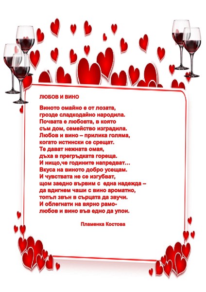 Стихотворението „Вино и любов“ спечели голямата награда от конкурса „Любов и вино. Вино и любов“. Проявата се организира за първа година от ръководството на Народно читалище „Светлина“ в Караманово. Автор на наградената творба е Пламенка Костова, бивша учителка в местното школо. Инициативата за написване на стихотворение, посветено на 14 февруари – Деня на виното и влюбените, придоби голяма популярност. В надпреварата се включиха общо 16 участника. Изключителна активност проявиха творците към читалище „Христо Ботев“ в Ценово. За участие в конкурса беше изпратено стихотворение и от българка, живееща в Нидерландия. Победителката получи наградата си лично от кмета на Караманово Бисер Блажев при спазване на задължителните противоепидемични мерки. Всички участници в конкурса ще получат грамоти и скромни подаръци.