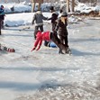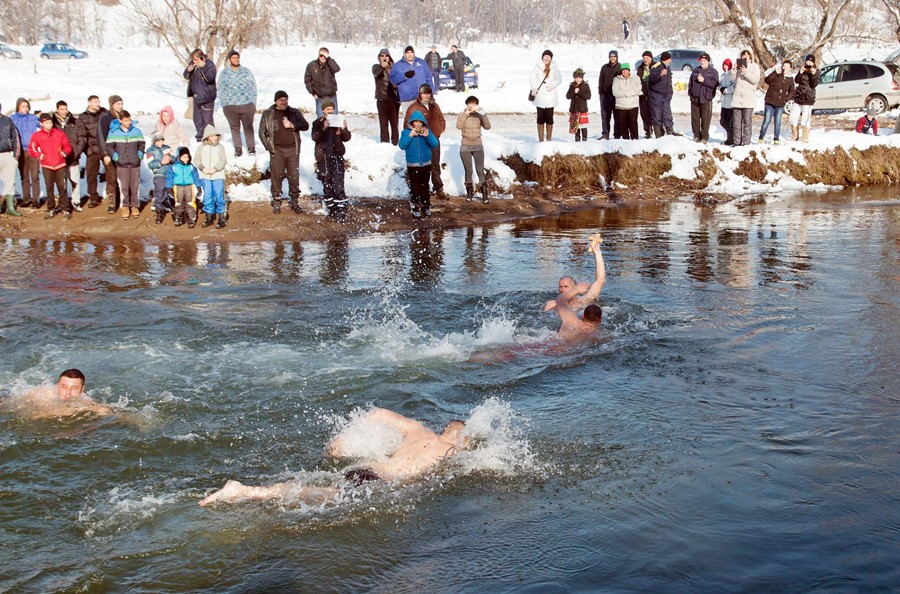 Миналата година традицията бе прекъсната, заради наносите в местната река от големите наводнения през 2014. Поради ниските температури и ледохода, в реката не бяха вкарани коли и ремаркета за празнуващите, но за децата имаше замръзнала ледена пързалка, пише Булфото.