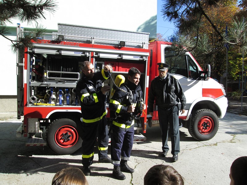 Инспектор инж. Светослав Войчев и неговите колеги направиха демонстрация на противопожарна техника, споделиха с децата как действат при пожар, какво е облеклото на пожарникаря, защо е важно да се евакуират от горящата сграда.