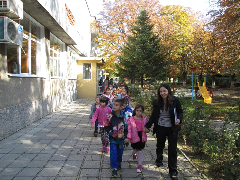 Урокът започна със сигнал за пожар от пожароизвестителната система в детската градина и евакуация на децата от „горящата“ сграда.