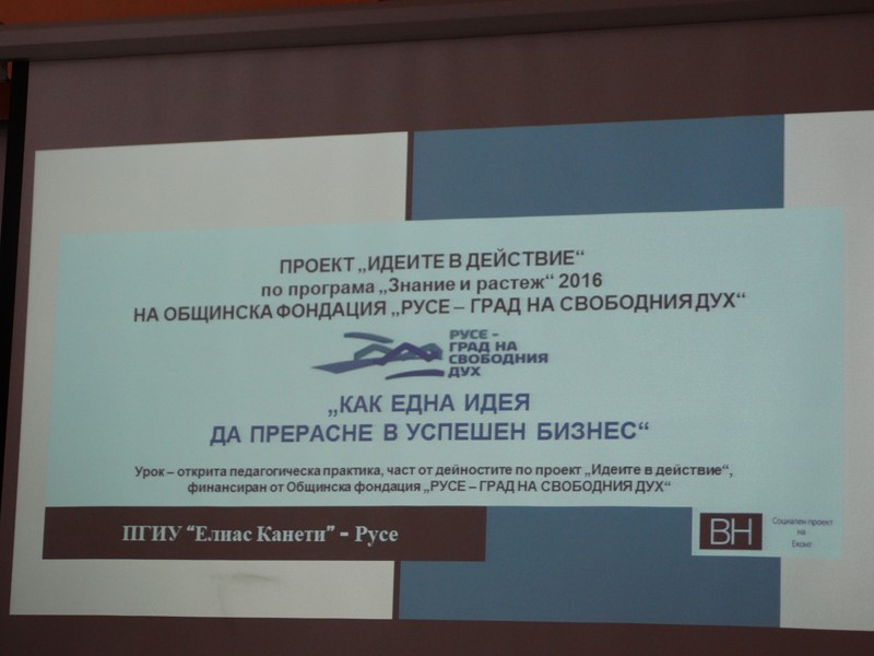 Урокът е организиран в рамките на дейностите по проект „Идеите в действие“ по програма „Знание и растеж“ 2016 на Общинска фондация „Русе – град на свободния дух“.