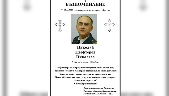 Припомняме че Николаев загина нелепо при гасене на пламнала къща в Бяла през август миналата година. 57-годишният пожарникар и още петима негови колеги са се борили с пламъците на покрива на сградата, когато Николай изведнъж полетял от близо 10 метра и паднал върху счупена пейка. В резултат на инцидента младши инспекторът получи тежки травми на гръбначния стълб и на гръдния кош и въпреки отчаяната борба за живота му в УМБАЛ Русе почина в Спешно приемно отделение.