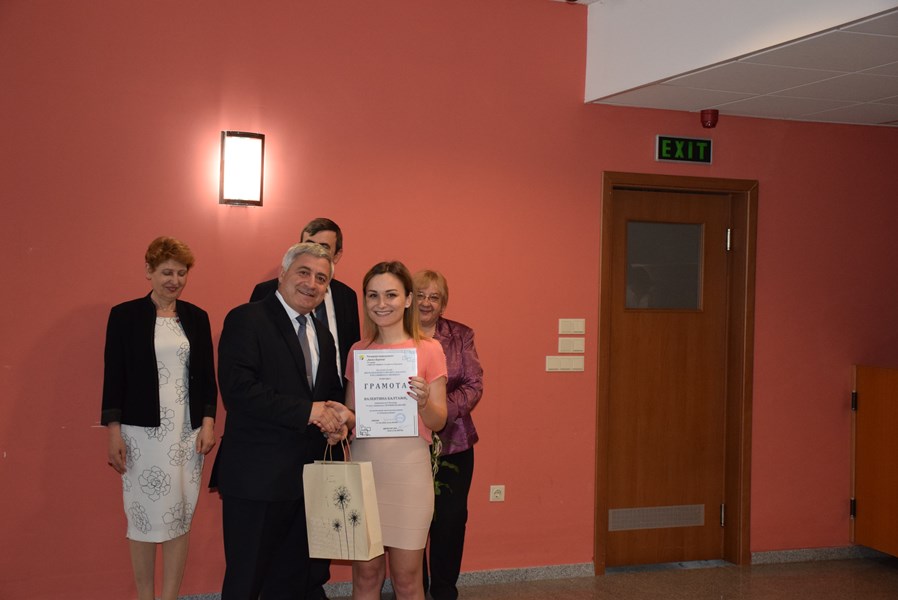 Общо 36 младежи бяха наградени за много добър и отличен успех, а пълният отличник сред тях е четвъртокурсничката от специалност "Промишлен дизайн" Валентина Балтаджи от Молдова.