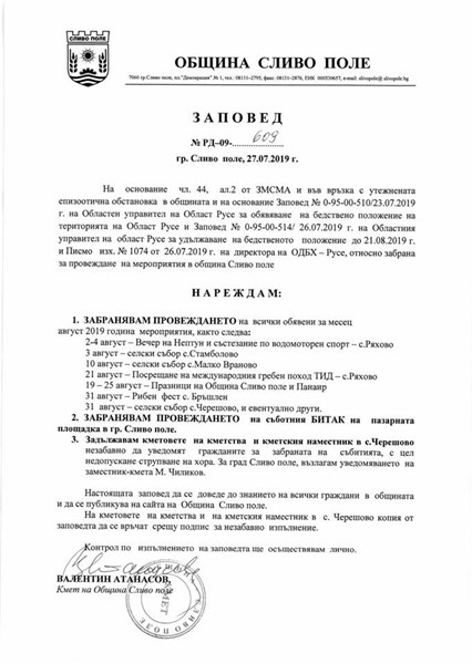 В края на срещата В. Атанасов обяви на присъстващите заповедта за забрана на всички обявени общински мероприятия през месец август. Сред тях са Вечер на Нептун и състезание по водомоторен спорт в с. Ряхово, селските събори в Стамболово, Малко Враново и Черешово, както и празниците на община Сливо поле, а също и рибният фест в с. Бръшлен. Предвидено е международният гребен поход ТИД – с. Ряхово само да премине по р. Дунав покрай село Ряхово, като участниците в него нямат да слизат на брега.