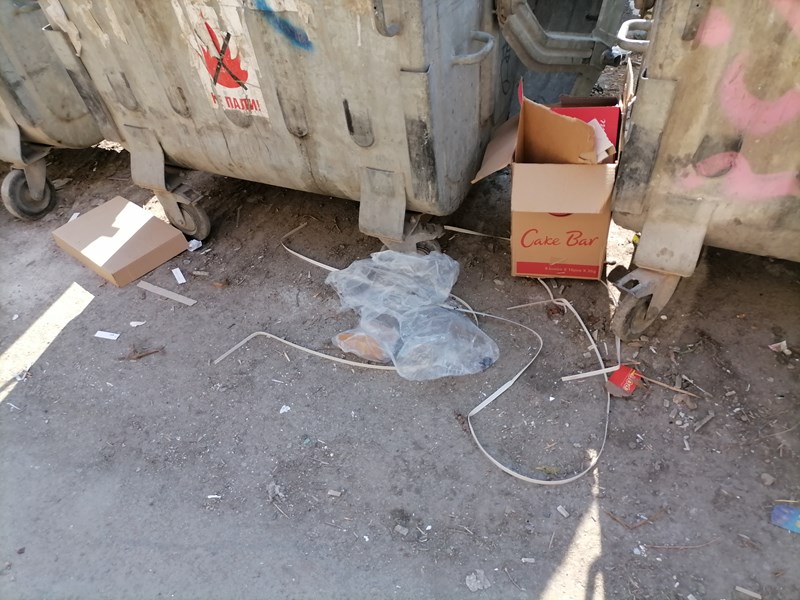 По този начин служителите на магазини Пацони си изхвърлят отпадъците след като си заредят магазините. Всичко в общите контейнери. Даже не си правят труда да срежат кашоните, че да не заемат всичкото място в контейнера.