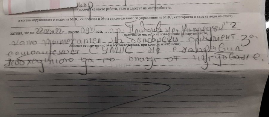 „Вчера бях в КАТ, когато поисках документи за възстановяване на шофьорската книжка. Обстоятелства, при които съм изгубил документите – на което беше написано, че са изгорели на ферибота Игуменцица-Бриндизи. След попълването на тях, служител ми каза, че трябва да бъде написан акт за изгубени документи.“
