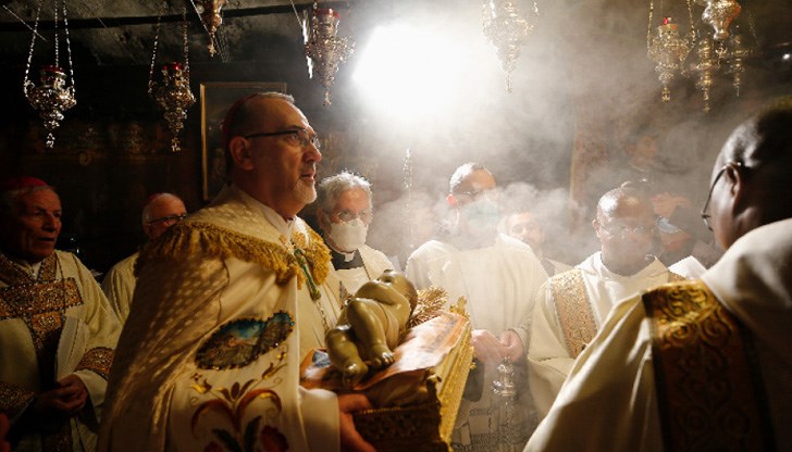 Във Витлеем беше отслужена среднощната литургия в църквата „Рождество Христово“ от Латинския патриарх на Ерусалим - Пиербатиста Пицабала, предава БНР.