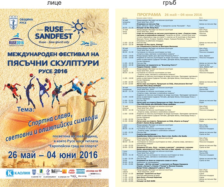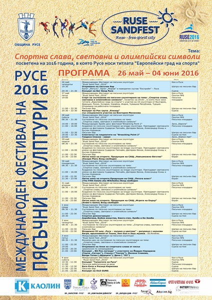 На 27.05.2016г. от 19 ч. ще бъде даден официалният старт на състезание по пясъчно скулптиране на тема: „Спортна слава, световни и олимпийски символи” и ще бъде открита работната площадка на фестивала. В рамките на Международния фестивал на пясъчни скулптури е предвидена богата съпътстваща програма, която включва интересни събития, концерти и лятно кино на открито, входът е свободен. Церемонията по награждаването на тазгодишните лауреати на Ruse Sand Fest’2016 е на 3 юни от 19:00 часа, когато официално ще бъде открита и Алеята на спортната слава. Събитието ще завърши с концерт „ BG Рок легенди” с участието на Йордан Караджов ( Група „Сигнал”), Стенли (”Тангра”), Милена Славова, Валди Тотев („Щурците”), Дичо ( “D2”).