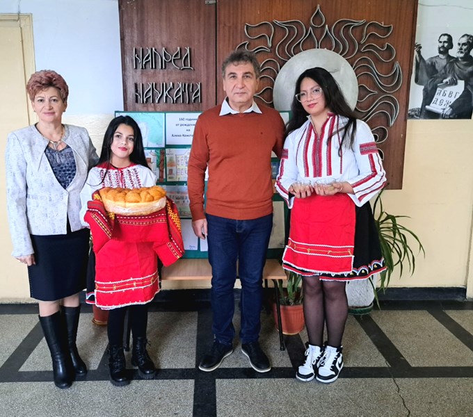 Гостите бяха посрещнати по стар български обичай с хляб и сол на входа на училището от директора Юлиян Гюрчев, заместник-директора на училището Жулиета Чавдарова и девойки от V клас, облечени в народни носии, съобщиха от учебното заведение.