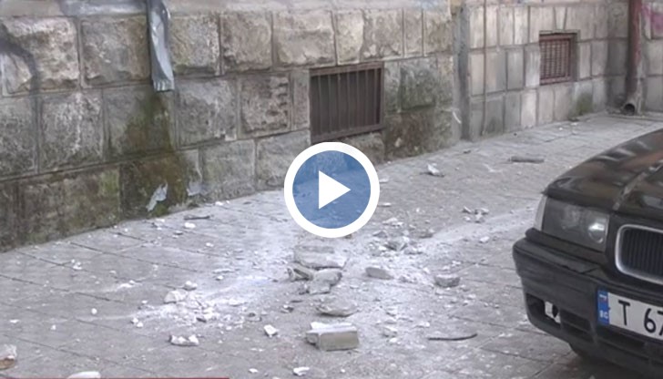 Големите каменни отломки се откъснали от фасадата на сградата и се разбили на тротоара вчера вечерта. По чудо няма пострадали пешеходци и не са нанесени щети по паркирани автомобили.