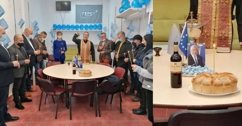 Разпространени бяха и официални снимки от събитието. По-внимателно вглеждане в тях обаче събуди недоумение. Защото на масата, редом до питката и виното има фотопортрет на председателя на ГЕРБ и премиер на България Бойко Борисов, а около масата присъстващите са свели глави със запалени свещички в ръка. Точно по такъв сценарий - питка, вино и портрет на покойника, в православните църкви в България се отслужват панихиди (единствената разлика е, че на масата в Поморие няма жито).