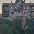 Парче от покривна настилка виси от блок "Иван Дечев" в квартал "Родина" след бурята в Русе.