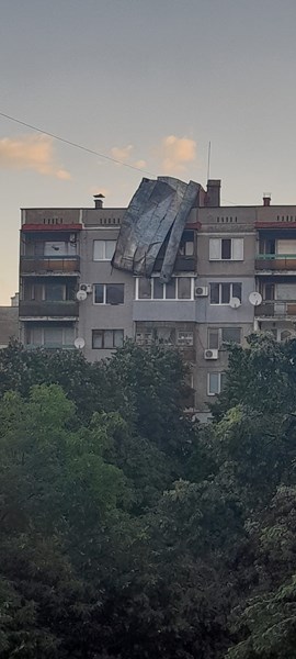 Парче от покривна настилка виси от блок в квартал "Родина" след бурята