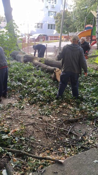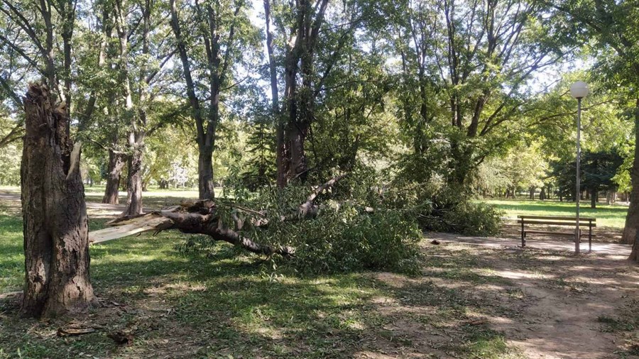 Започна акция на екипите на ОП „Паркстрой“ за ръчно и механизирано разчистване на паднали дървета и клони от улици, тротоари и градини в Русе след вчерашния силен вятър.