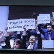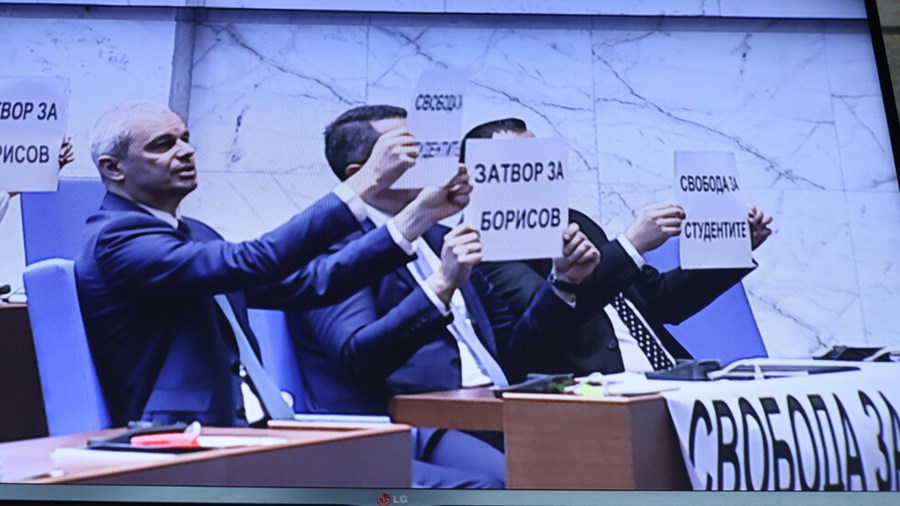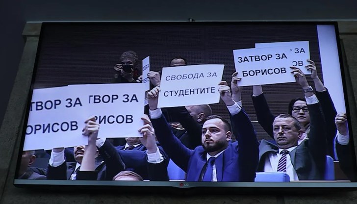 Представителите на "Възраждане" поставиха плакат с надпис: "Свобода за студентите. Затвор за Борисов" на първия ред пред депутатските банки. Освен това, те вдигнаха и разпечатани листове със същото послание в пленарната зала.