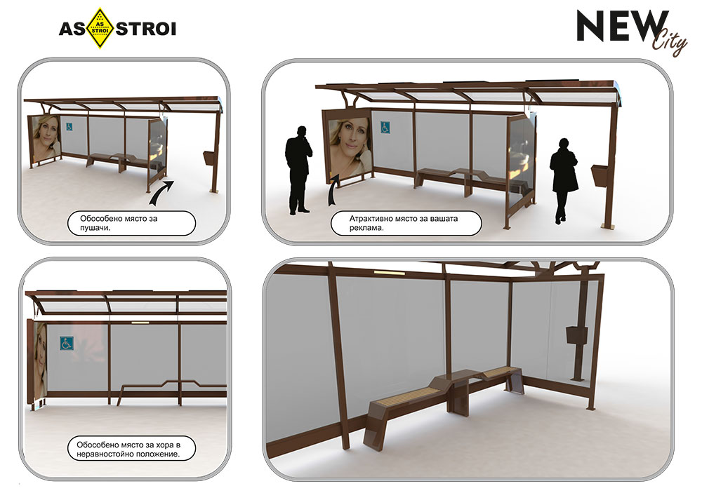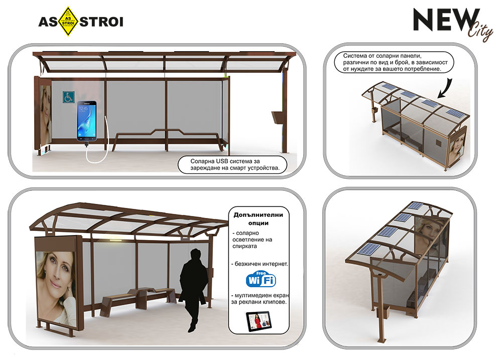 NEW CITY са първите автобусни спирки в страната със соларни панели захранващи осветление за чакащите и осветление за рекламния панел, както и докинг станция за зареждане на смартфони, човек докато чака автобус да може да зареди смартфона или таблета си. Изработено е място за пушачи, място за инвалидни колички и специално разработена пейка.
