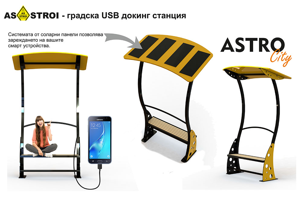 От тук развихме идеята за поставяне на рутер за безжичен интернет Wi-Fi. Така се спряхме на изделие, което е новост за нашия пазар Градска USB докинг станция. Това изделие е в серията ASTRO CITY. Подходящо е за туристически обекти, където хората правят много снимки, които качват в интернет и батериите на телефоните им падат бързо.