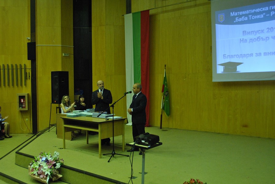 „Като кмет на Община Русе силно вярвам, че младите хора, които днес прекрачвате за последно училищния праг ще сте едни от най-успешните Посланици на Русе. Потенциалът и бъдещето на нашия град е в умовете и сърцата ви, във волята и желанието да запазите традициите и да работите активно за неговото икономическо, социално, интелектуално и културно възраждане. Винаги носете със себе си част от свободния дух на своя роден град“, обърна се кметът към абитуриентите.