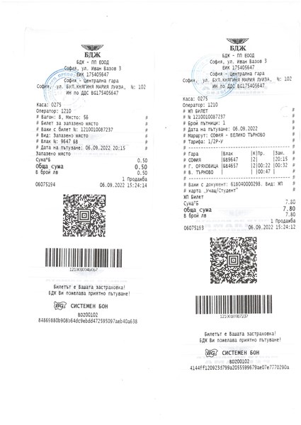 Изпращам и снимка на билета си, на който е отразено кога влаковете трябва да тръгнат от гарите.