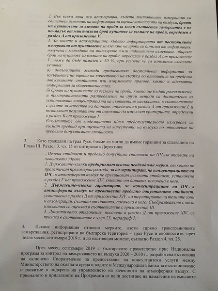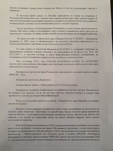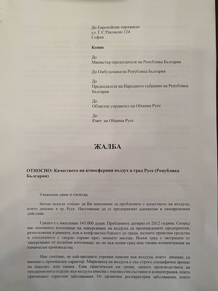 "Жалба за качеството на атмосферния въздух в град Русе, която е отправена до Европейския парламент и до няколко български институции, включително и до кмета на община Русе, получих днес.