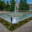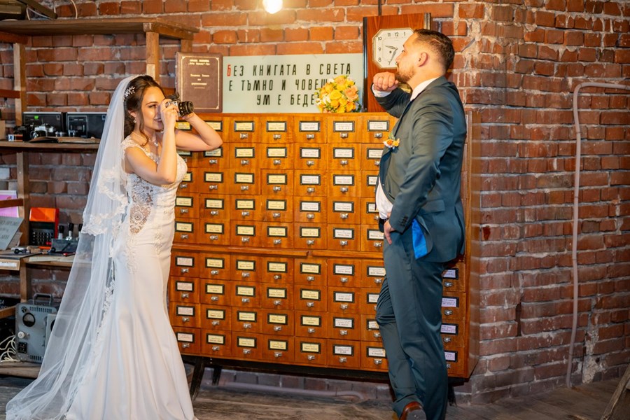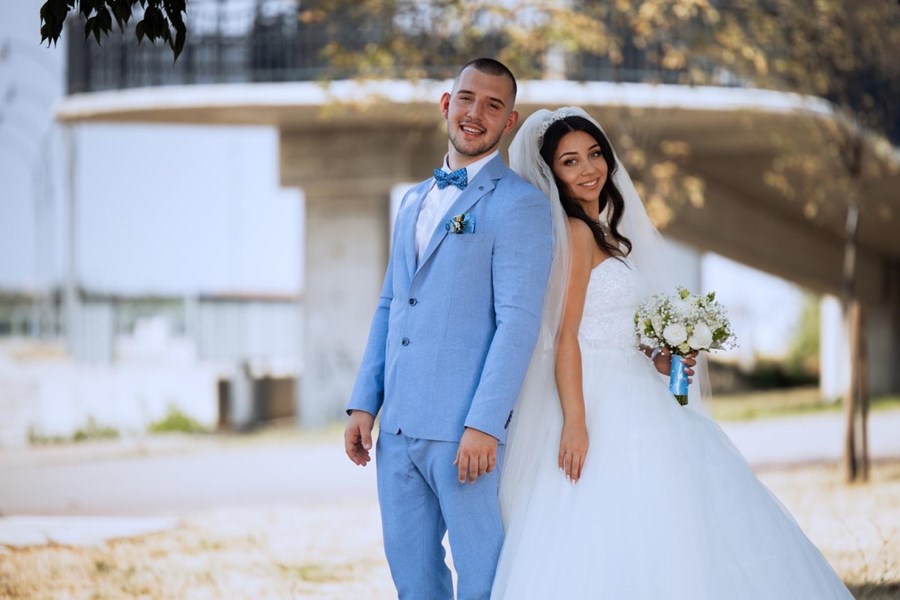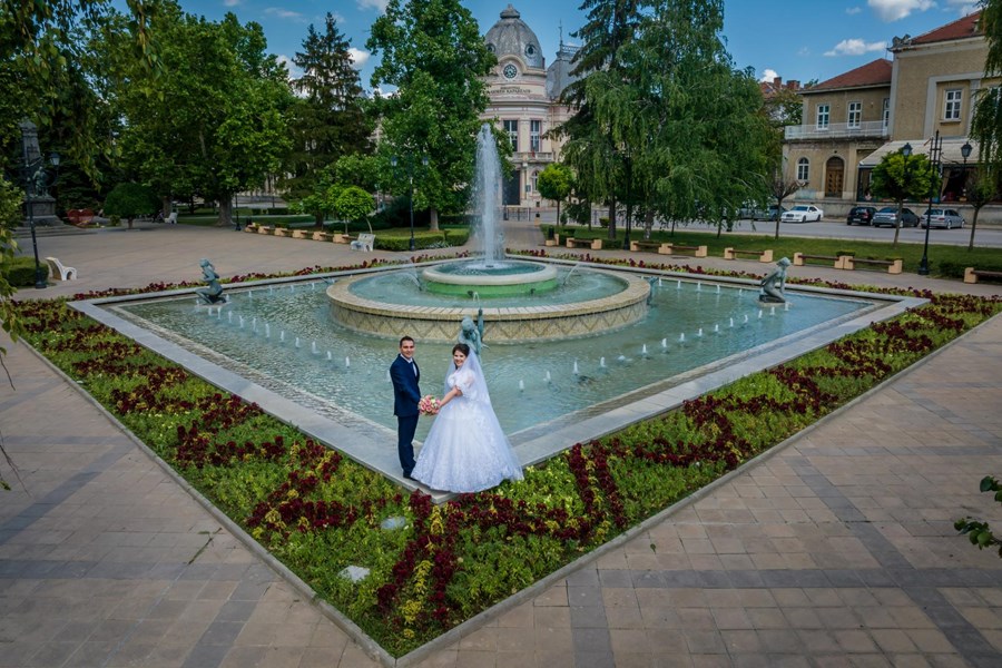 Мария и Георги Черкезови, които сключват брак на 15 юни 2024 година, избират за своята фотосесия площад "Княз Александър Батенберг". Техният кадър, заснет от височина, улавя емблематичния шадраван с Регионалната библиотека и Старата поща на заден план.