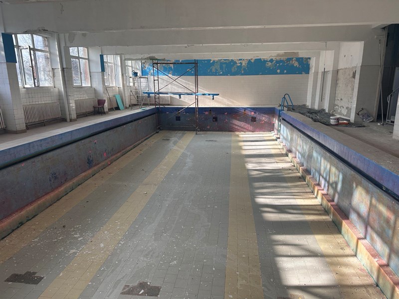 Реконструкцията включва цялостно обновяване на облицовката на съоръжението и помещението около него. В момента тече ремонт на санитарните помещения и съблекалните. Предстои модернизация на системата за отвеждане на влагата - дейност, която не е извършвана десетилетия наред.