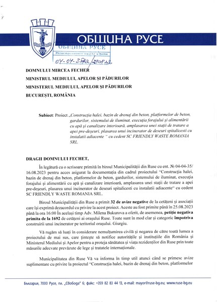 Писмото бе изпратено по-рано (на 25 август) и до българския министър Юлиян Попово и в него се прилагат всички становища „против“, входирани в деловодството на Общината, както и организираната от граждани подписка, в която се включиха близо 1700 русенци.