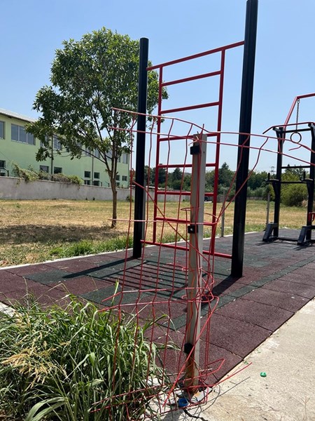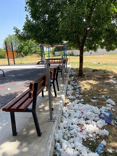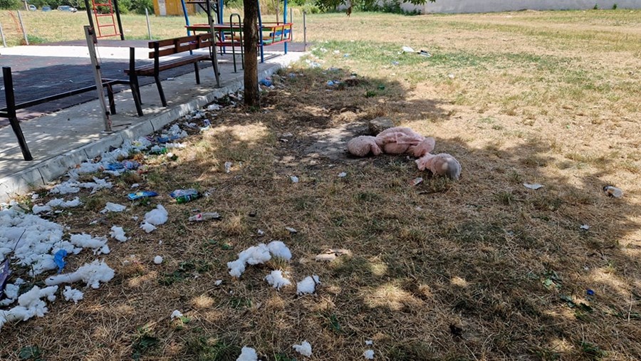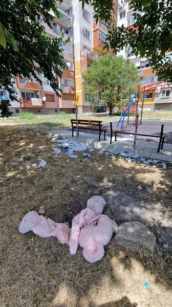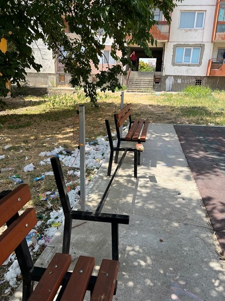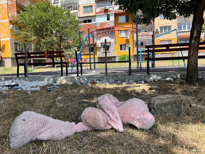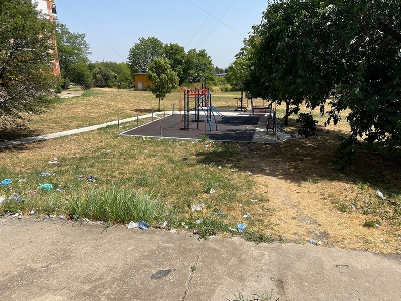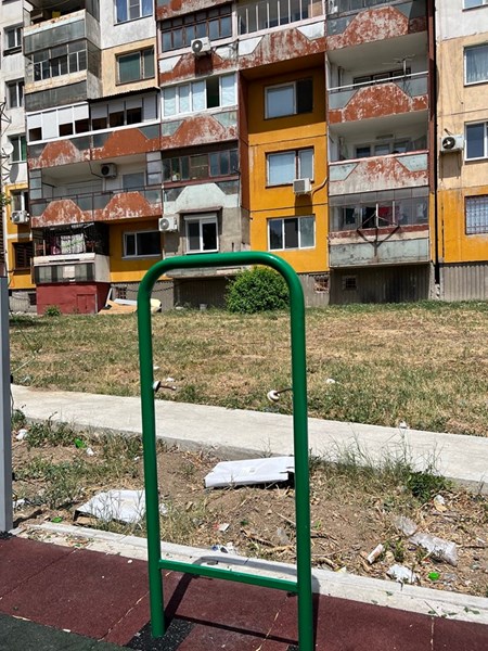 Това е детска площадка зад един русенски блок. Направихме я преди две години, защото имаше тонове изхвърлени от прозорците отпадъци, които бяха като “голям бариерен риф” зад блока. Почистихме с гондоли десетки тонове отпадъци, трупани с години. За месеци те се появиха отново, хвърляни от прозорците от съгражданите ни. След като ги почистихме пак, реших да изградим детска площадка. Исках да видя дали ще хвърлят там, където играят децата им. Към момента площадката е унищожена - счупени покрив и пейки, липсваща изцяло ограда, кошче. Всичко е затрупано с боклуци.