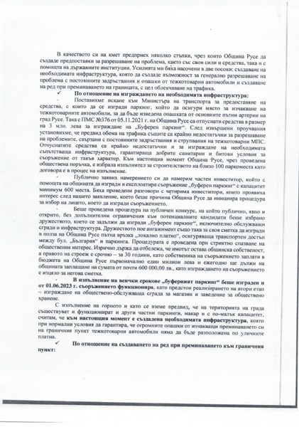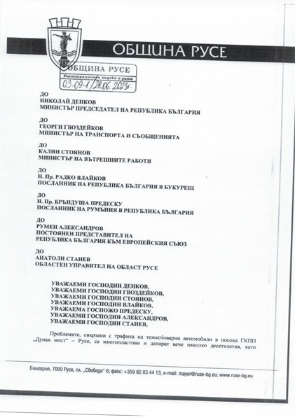 В официални писма до министър-председателя Николай Денков, министъра на транспорта Георги Гвоздейков и на вътрешните работи Калин Стоянов кметът на Русе Пенчо Милков представи организацията на работа на новооткрития тир паркинг и реда за преминаване през ГКПП „Дунав мост“. Документът бе адресиран и до посланика на България в Румъния Н. Пр. Радко Влайков, посланика на Румъния в България Н. Пр. Бръндуша Предеску, постоянния представител на България в ЕС Румен Александров и областния управител Анатоли Станев.