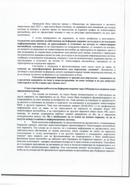 „Не е необходимо да се влиза на новия паркинг, за да бъде получен номер в единната информационна система“, посочва Пенчо Милков. В позицията на Община Русе се подчертава, че настоящата информационна система за проследяване и отчетност на потока от тежкотоварни автомобили, която операторът на съоръжението използва, превръща познатите от десетилетия на русенци километрични опашки във виртуално изчакване. Кметът настоява фирмата оператор да продължи да предоставя поредни номера на всички камиони, престояващи на територията на общината, на които предстои да преминат границата, независимо дали са влезли в новооткрития паркинг и ползват неговите удобства или престояват на друго подобно съоръжение. За да се гарантира спазването на реда, Пенчо Милков ще предложи на „Тир Паркинг Русе“ и сключването на официално писмено споразумение.
