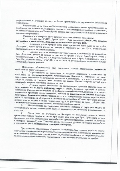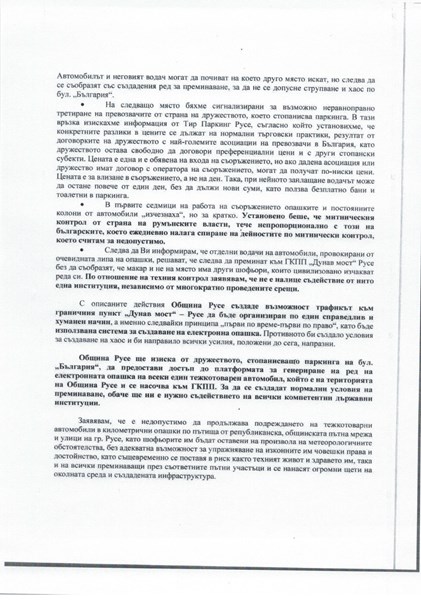 „След това писмо, в качеството ми на кмет на Община Русе и на основание чл. 44, ал. 1, т. 2 и 4 от ЗМСМА, ще установя ред за преминаване на тежкотоварните автомобили, като се съобразяват с виртуалната опашка. Софтуерът за подреждане на камионите ще бъде под мониторинга на Община Русе. Шофьорите, избрали да почиват и изчакват в други паркинги, ще бъдат длъжни също да имат номер и когато дойде ред да навлязат на територията на граничния пункт на Република България, ще получават информация по телефон“, посочва кметът.