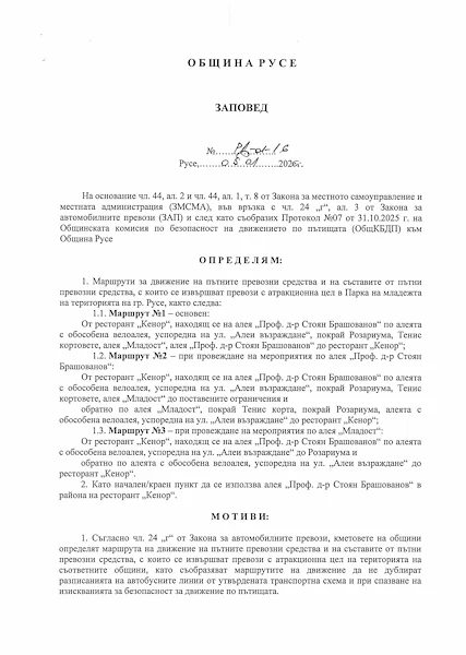 Кметът на Русе Пенчо Милков официално подписа заповедта, с която слага край на движението на атракционни влакчета в централната градска част. Административният акт, който беше анонсиран още в края на миналата година, вече е факт и влиза в сила с амбицията да реши конфликта между пешеходци и атракциони, но и с риска да създаде нови проблеми в зелените зони на града.