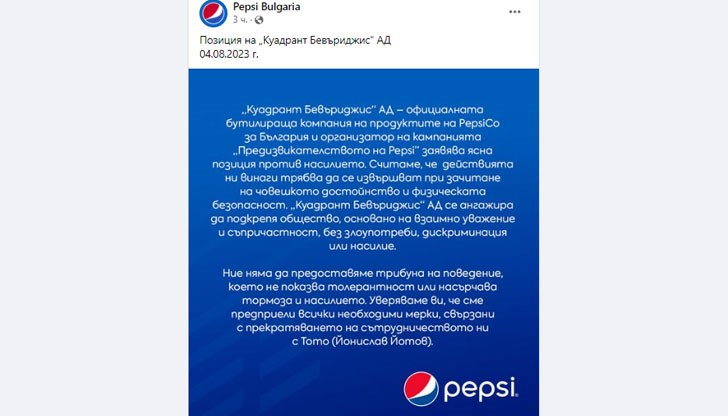 „Пепси“ прекрати договора си с Йонислав Йотов – Тото след припомнянето на епизод от подкаст шоуто му, в което треньорът Тити Папазов разказва с насмешка за насилие над своя бивша приятелка. В изявление от „Куадрант Бевърдижис АД“, официалната бутилирища компания на продуктите на „Пепси“ за България, отбелязват, че нямат намерение да дават трибуна за поведение, което не показва толерантност или насърчава насилието и тормоза.
