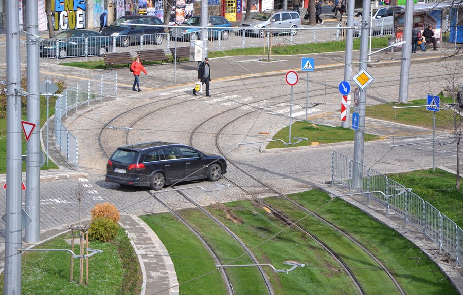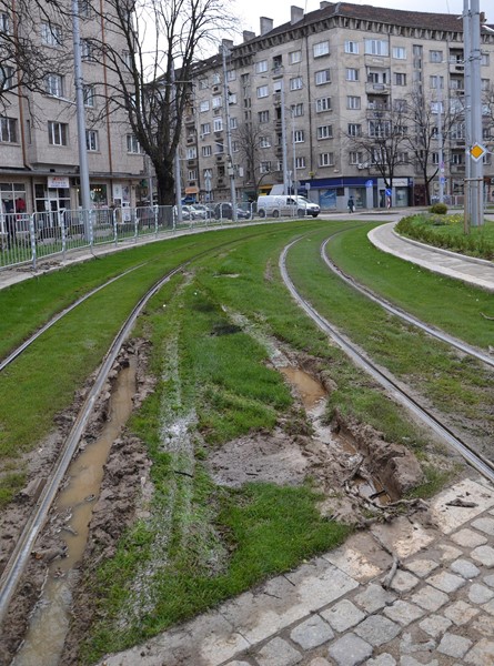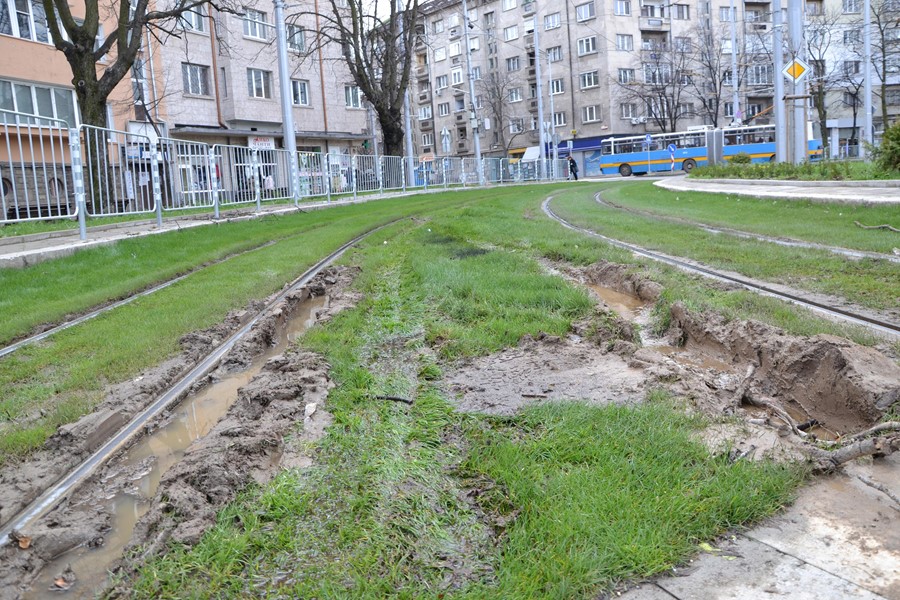 Огромните коловози в калта обозначиха поредното пътно нарушение върху "зелените" трамвайни релси в района Руски паметник.