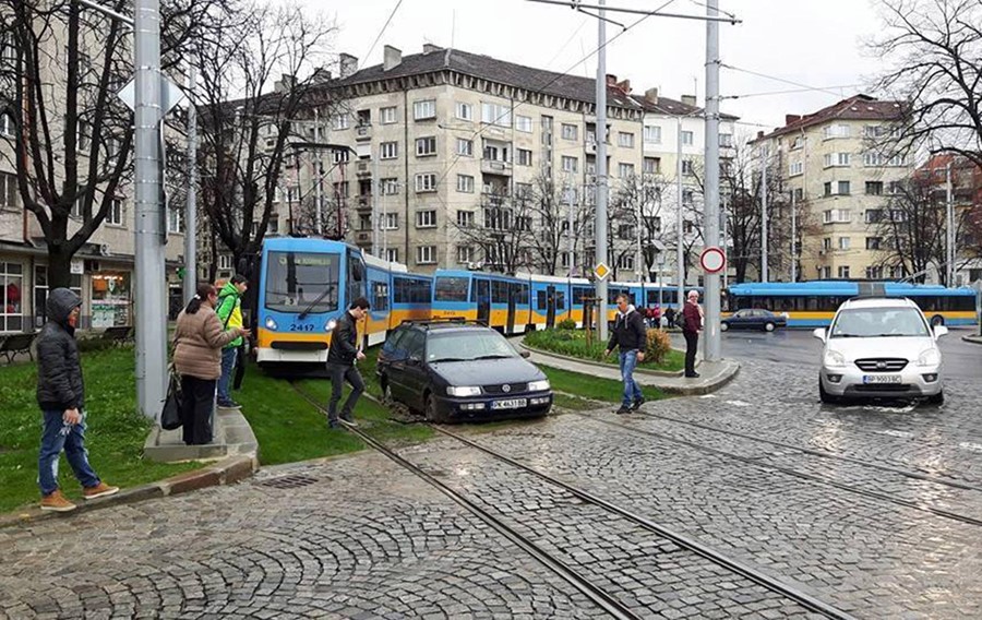 Тарикатът решил да избегне сутрешния трафик и неуспешно се опитал да мине през "зелените" трамвайни релси. След като закъсал в калта и блокира трамваите, водачът подложил сухи клони пред гумите си, за да изкара автомобила, преди да е забелязан от Пътна полиция.