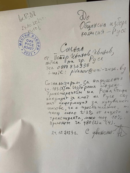„Аз, грешният, понеже съм съвестен гражданин, изпратих сигнал до ОИК - Русе за осъществено нарушение на Закона, вижте долу сигнала“, пише акад. Петър Иванов в „Свободно слово“.