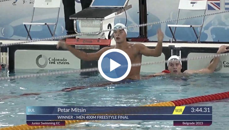 Блестящото представяне на Петър Мицин на европейското първенство по плуване за юноши и девойки в Белград продължава. Талантливият българин постигна исторически успех след феноменално плуване във финала на 400 метра свободен стил. Възпитаникът на Николай Вакареев финишира за 3:44.31 минути и подобри световния рекорд за юноши от 3:44.60 минути на австралиеца Мак Хортън поставен през 2014 година. Постижението е и нов европейски рекорд за юноши и нов рекорд на европейските шампионати, информира БНР.