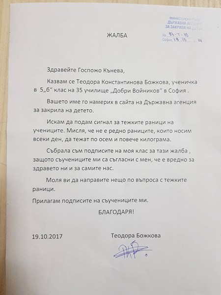 "Здравейте, госпожо Кънева! Казвам се Теодора Константинова Божкова, ученичка в 5 клас в училище "Добри Войников" в София. Вашето име го намерих в сайта на Държавната агенция за закрила на детето. Искам да подам сигнал за тежките раници на учениците. Мисля, че не е редно те да тежат по осем и повече килограма. Събрала съм подписите на съучениците ми, които са съгласни с мен, че това е вредно за здравето ни и за самите нас. Моля да направите нещо по въпроса".