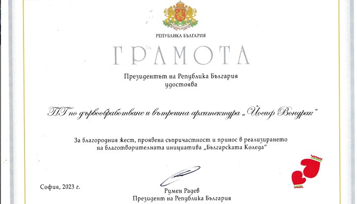 С почетна грамота на Президента на Република България и благодарствено писмо беше удостоен колективът от ученици, учители и служители на ПГДВА „Йосиф Вондрак“ за дарителския жест към инициативата Българската Коледа.
